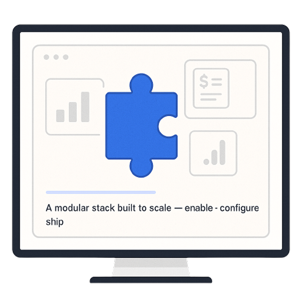 Turn features on as add-ons. No bloat, no plugin sprawl—just enable, configure, and ship.